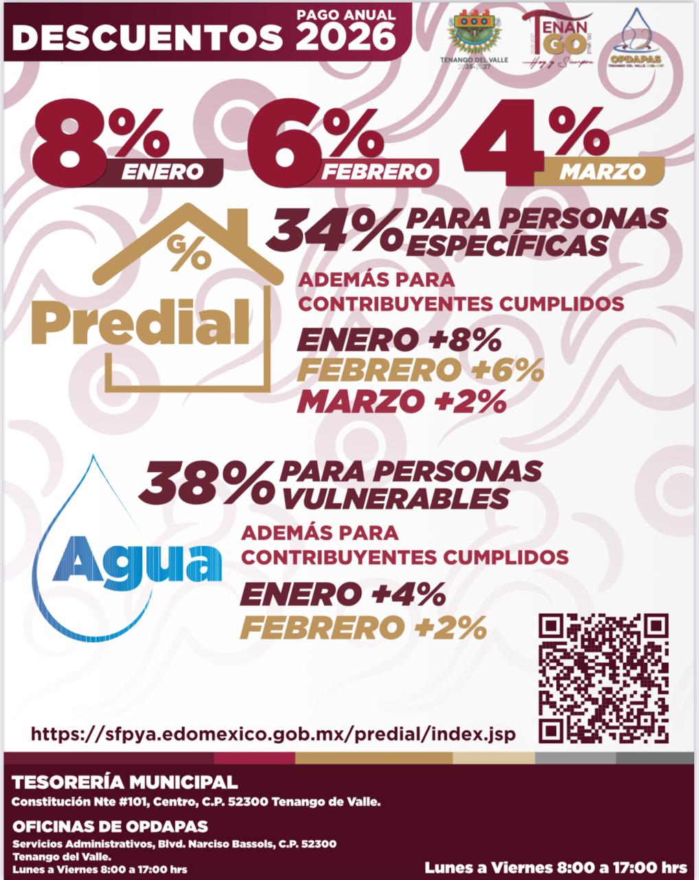 Tenango del Valle, México. – El Gobierno Municipal de Tenango del Valle, a través de la Tesorería Municipal y el Organismo Público Descentralizado para la Prestación de los Servicios de Agua Potable, Alcantarillado y Saneamiento (OPDAPAS), invita a la ciudadanía a aprovechar los beneficios fiscales vigentes para el pago anual 2026.