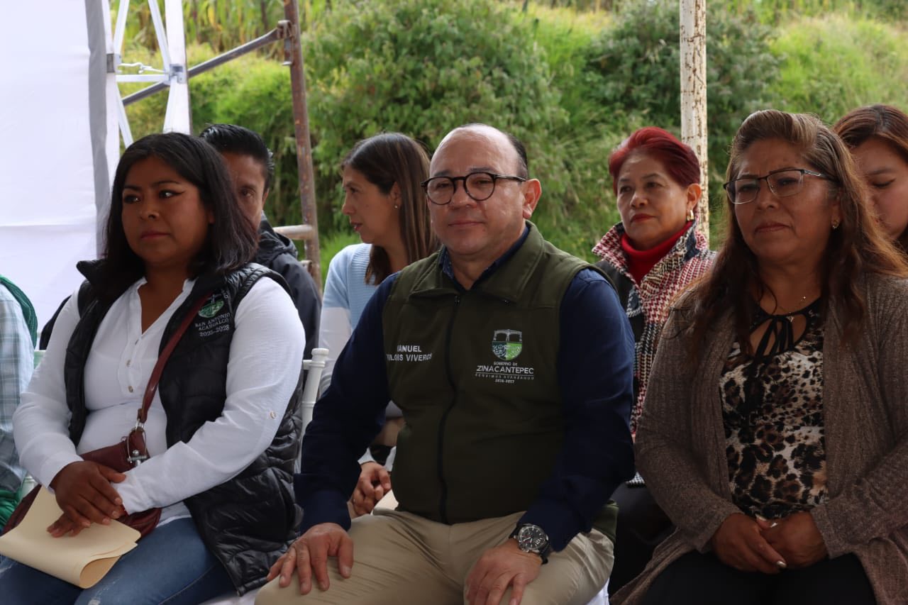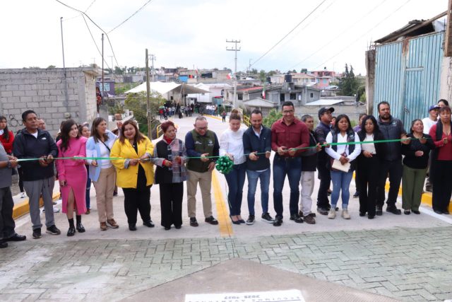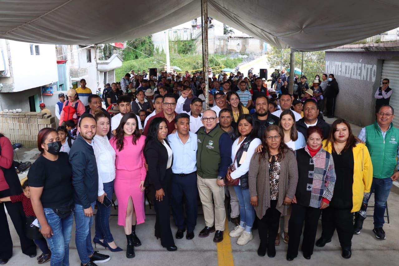 Zinacantepec, México. – Acompañado de autoridades auxiliares, integrantes de su cabildo, vecinas y vecinos realiza entrega Manuel Vilchis Viveros, presidente municipal de Zinacantepec la pavimentación del Camino al Colín en la comunidad de en San Antonio Acahualco, Zinacantepec.