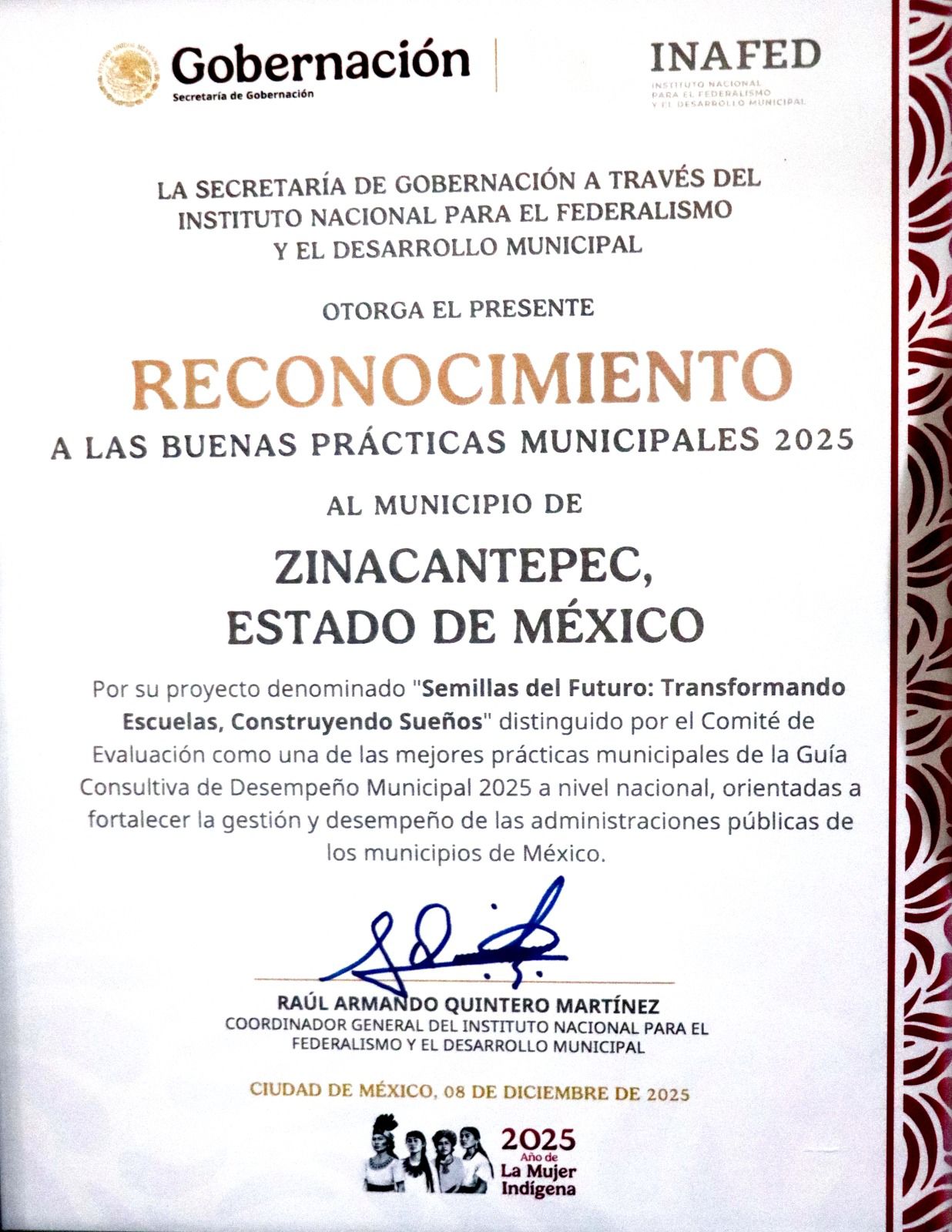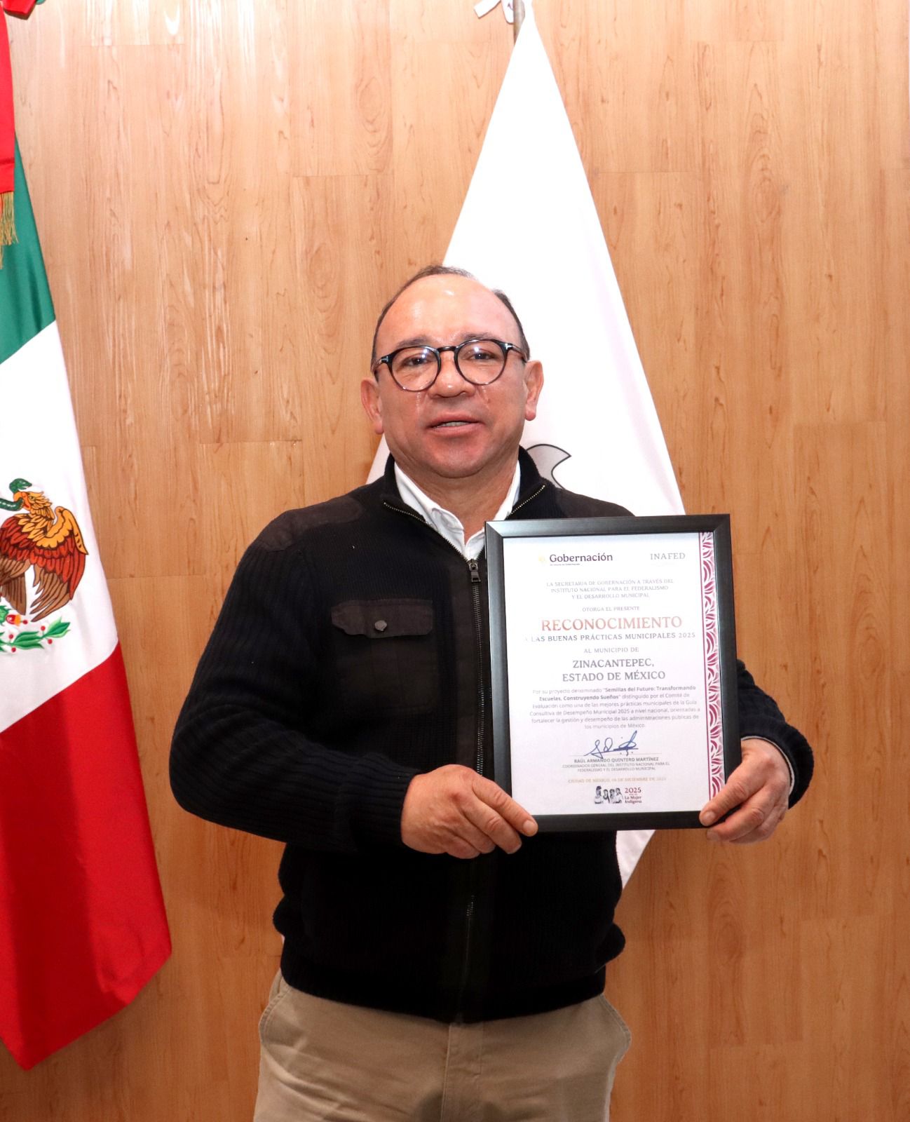 Con profundo orgullo, este reconocimiento fue entregado al Presidente Municipal de Zinacantepec, Manuel Vilchis Viveros, por parte de Raúl Armando Quintero Martínez, Coordinador General del Instituto Nacional para el Federalismo y el Desarrollo Municipal.